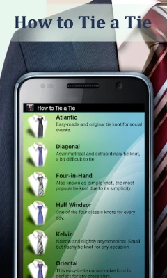 Many people would agree that making a tie is a big problem because we use them quite rarely. The new app How To Tie a Tie is a real life-saver for you if you don’t know how to knot ties. If you don’t have much practice in making necktie knots, start with making the simplest tie knots like Four-in-Hand or Simple Double. After that, you’ll get the idea of how to make other more difficult tie knots.