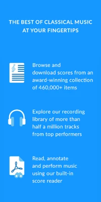 The IMSLP app allows you to browse the award-winning IMSLP / Petrucci Music Library, the largest free online sheet music library in the world, and to create your own library of scores and recordings.