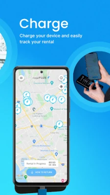Seamless Rentals: Scan the QR code on any chargeFUZE station to instantly rent a power bank with built-in cables for Apple and Android devices.